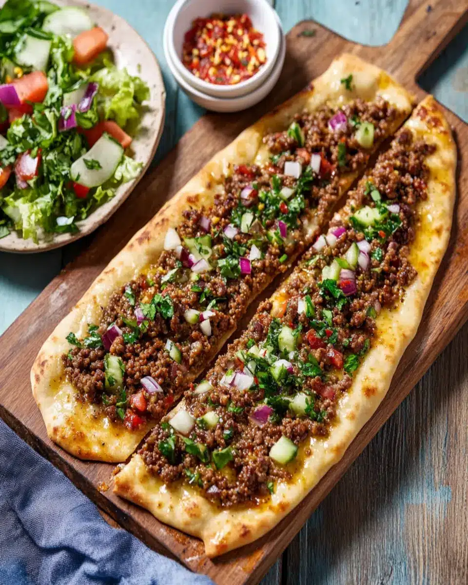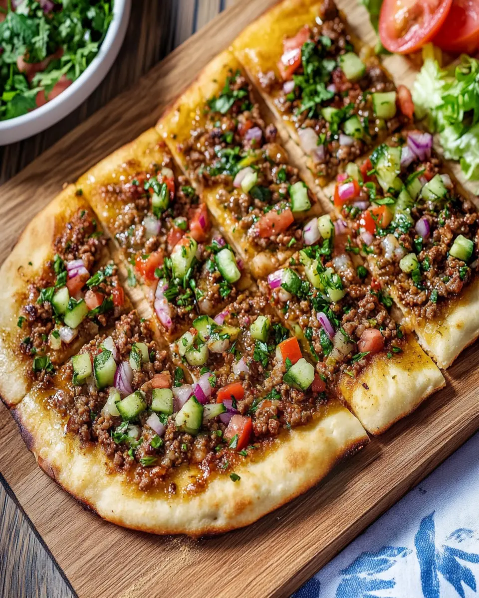 For a delightful presentation, garnish with freshly chopped parsley just before serving. Pairing your flatbread with a side of yogurt or a fresh salad can complement the flavors beautifully, providing a refreshing contrast to the savory meat topping.