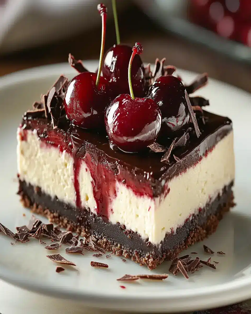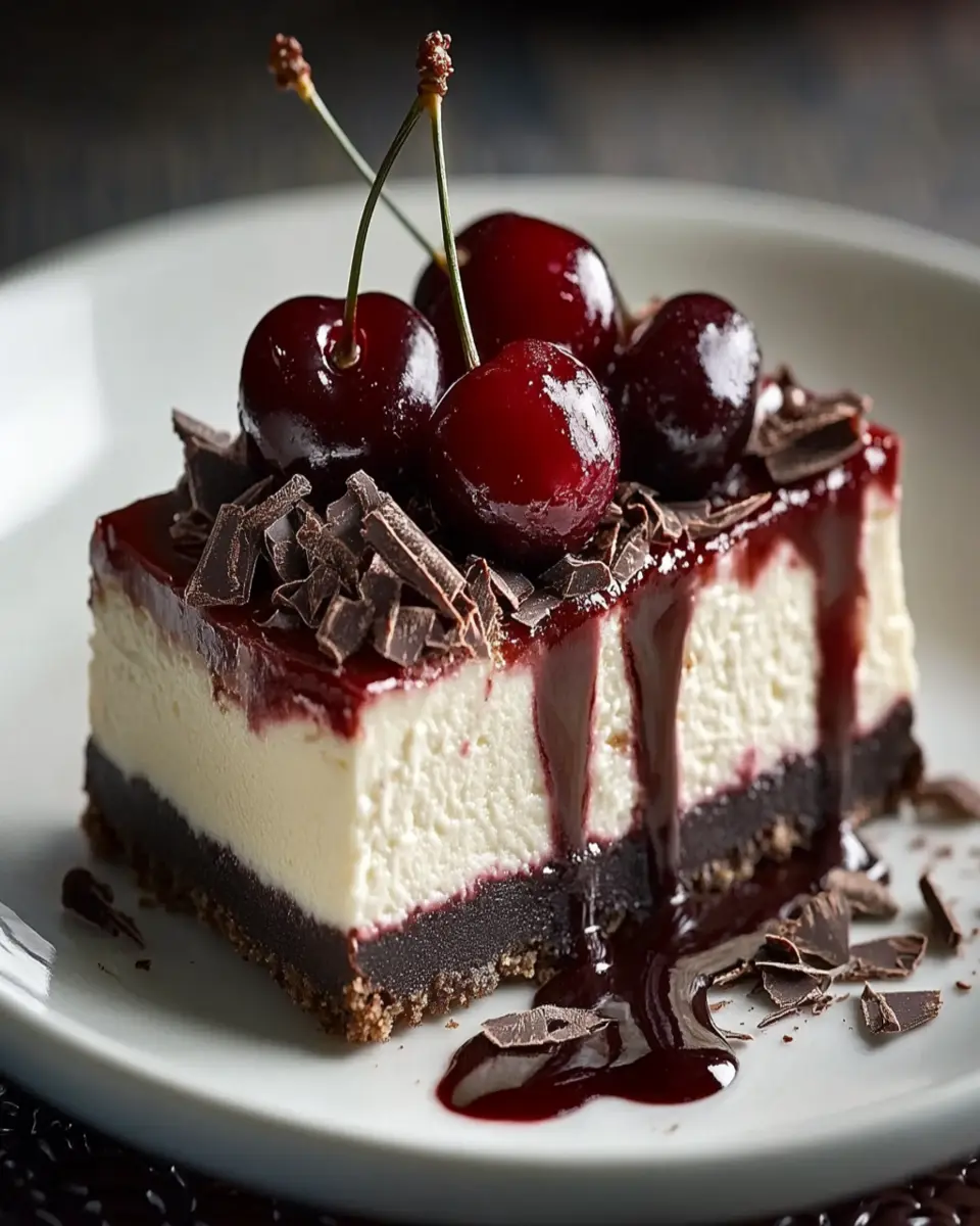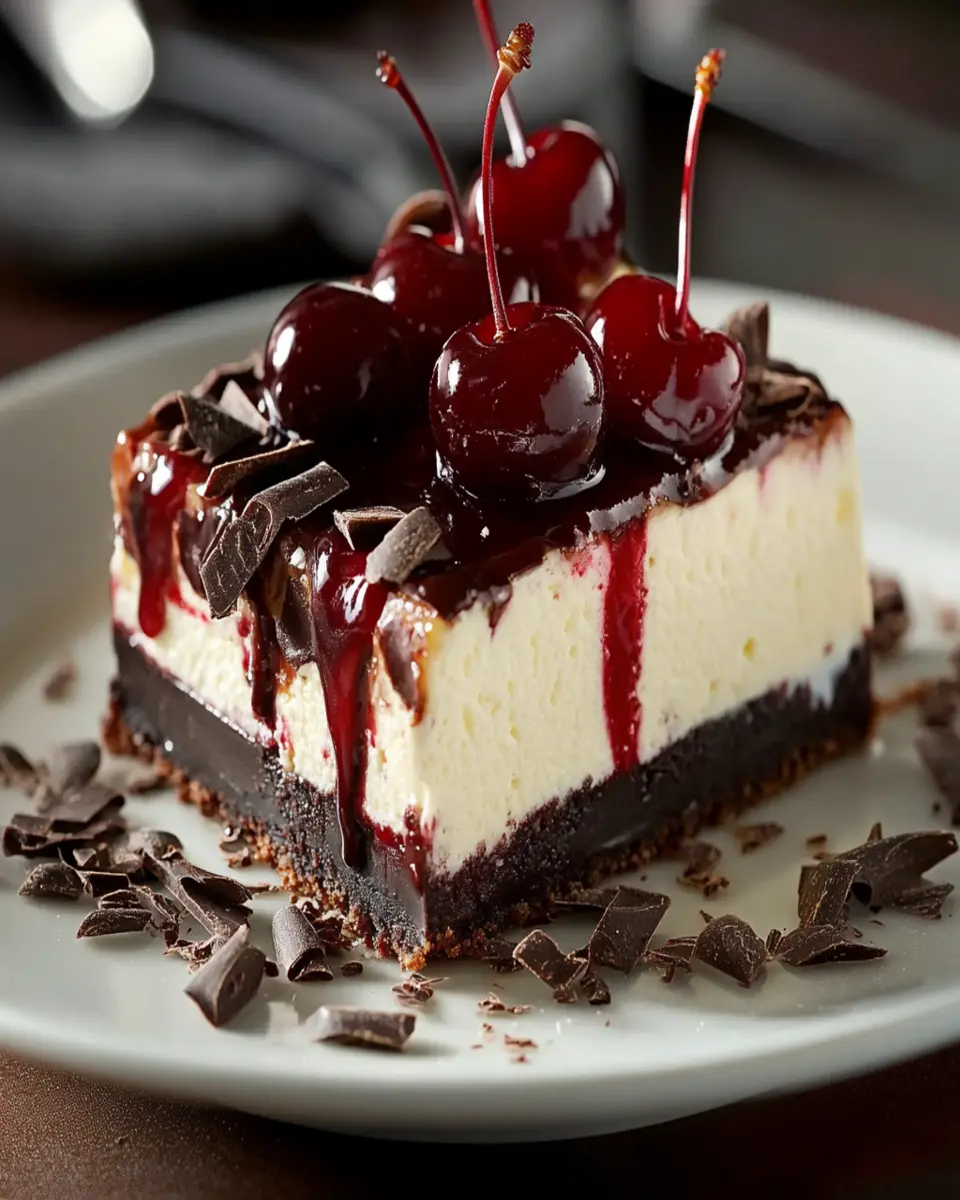 A luxurious dessert featuring rich chocolate, creamy cheesecake, and the tartness of cherries.