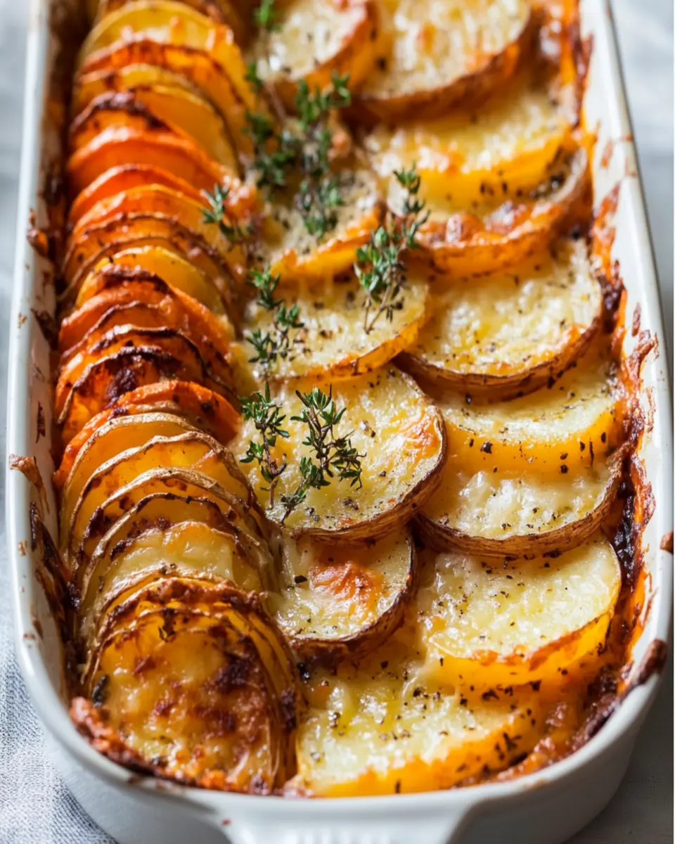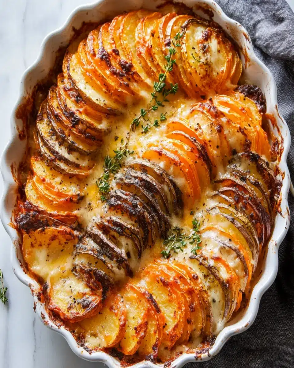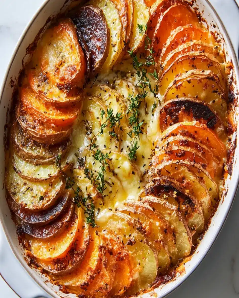 Cheesy Root Vegetable Gratin is a delicious dish that layers thinly sliced root vegetables, such as potatoes, carrots, and parsnips, with a rich cheese sauce. Baked until golden, it’s a comforting side dish perfect for any occasion.