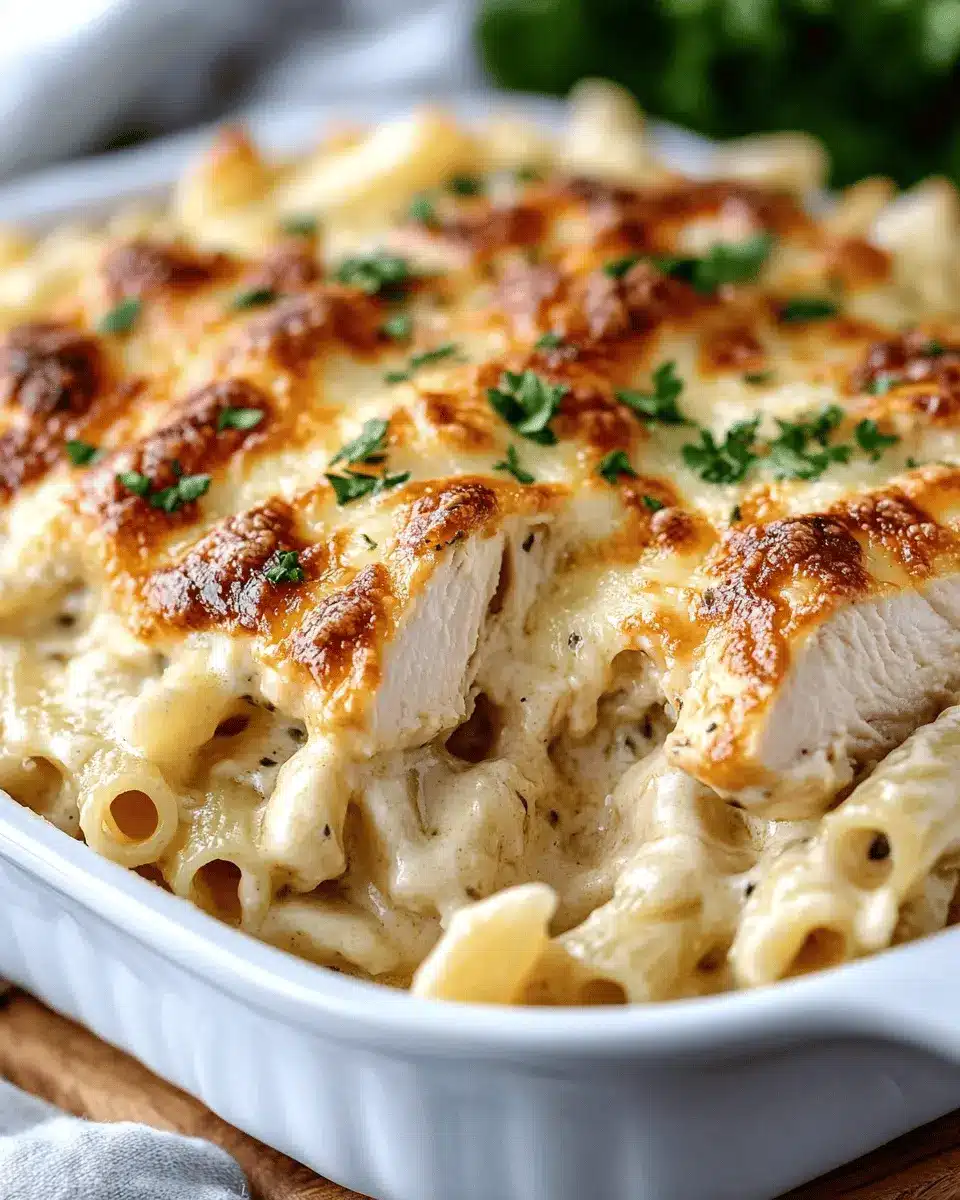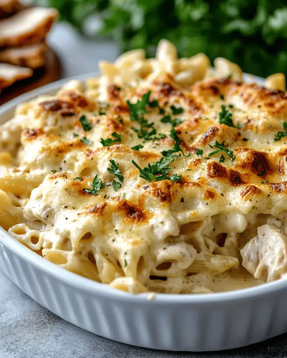 A creamy and cheesy Chicken Alfredo Pasta Bake that is perfect for a comforting dinner.