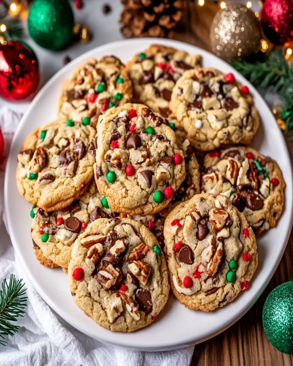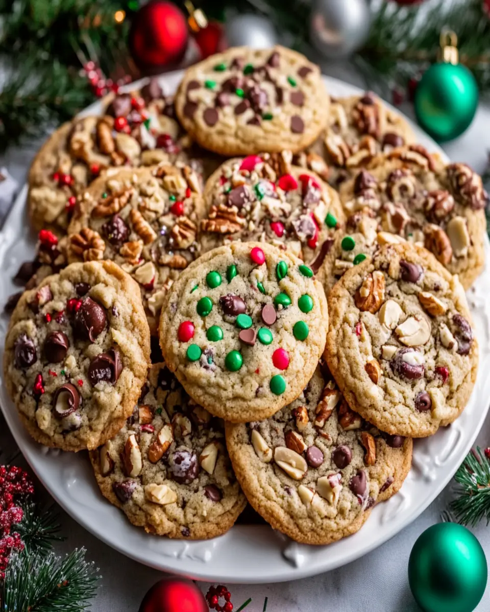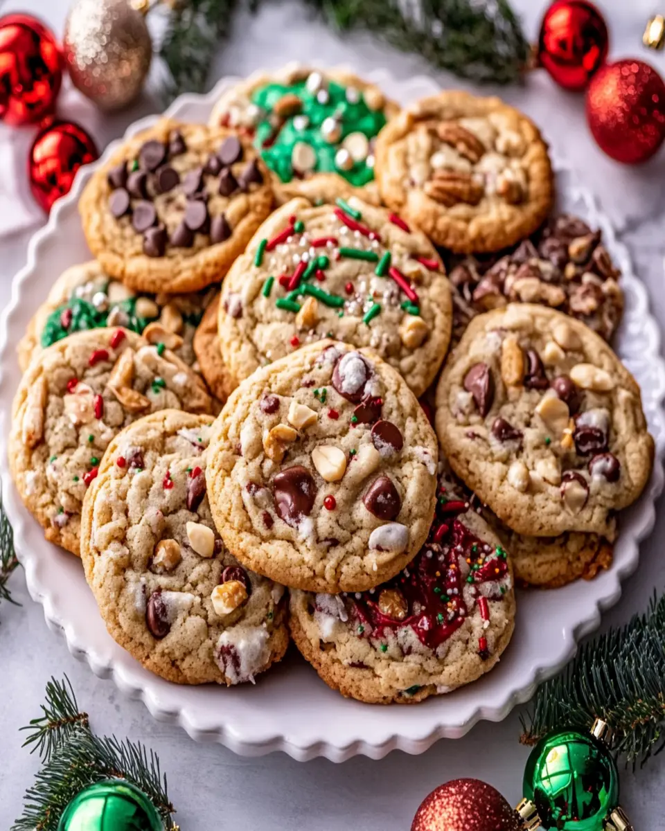 Delicious Christmas Kitchen Sink Cookies loaded with festive ingredients for the perfect holiday treat.