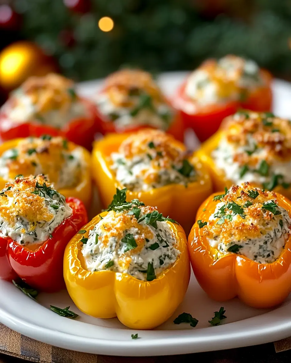 Deliciously festive mini peppers stuffed with a creamy herbed cheese mixture, perfect for holiday gatherings.
