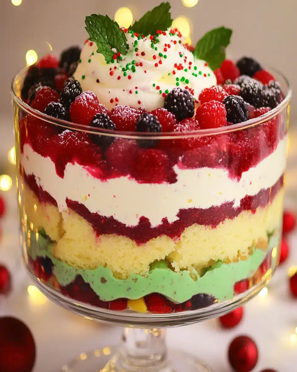 The Christmas Trifle Dessert is a showstopper that combines delicious flavors and textures in a festive way. Its layers of light sponge cake, rich custard, and airy whipped cream are topped with vibrant fresh fruits, making it not only a treat for the palate but also a feast for the eyes.