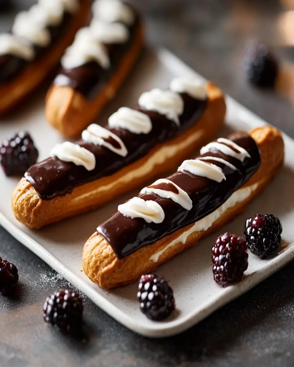 In conclusion, Classic Chocolate Éclairs are a delightful treat that showcases the art of French pastry-making. Their combination of a light and airy choux pastry, rich custard filling, and glossy chocolate glaze makes them a favorite among dessert lovers. Whether you’re celebrating a special occasion or simply indulging in a sweet craving, these éclairs are sure to impress. Don’t hesitate to try this recipe and share your creations with friends and family. Enjoy the satisfaction of crafting these classic pastries in your own kitchen!