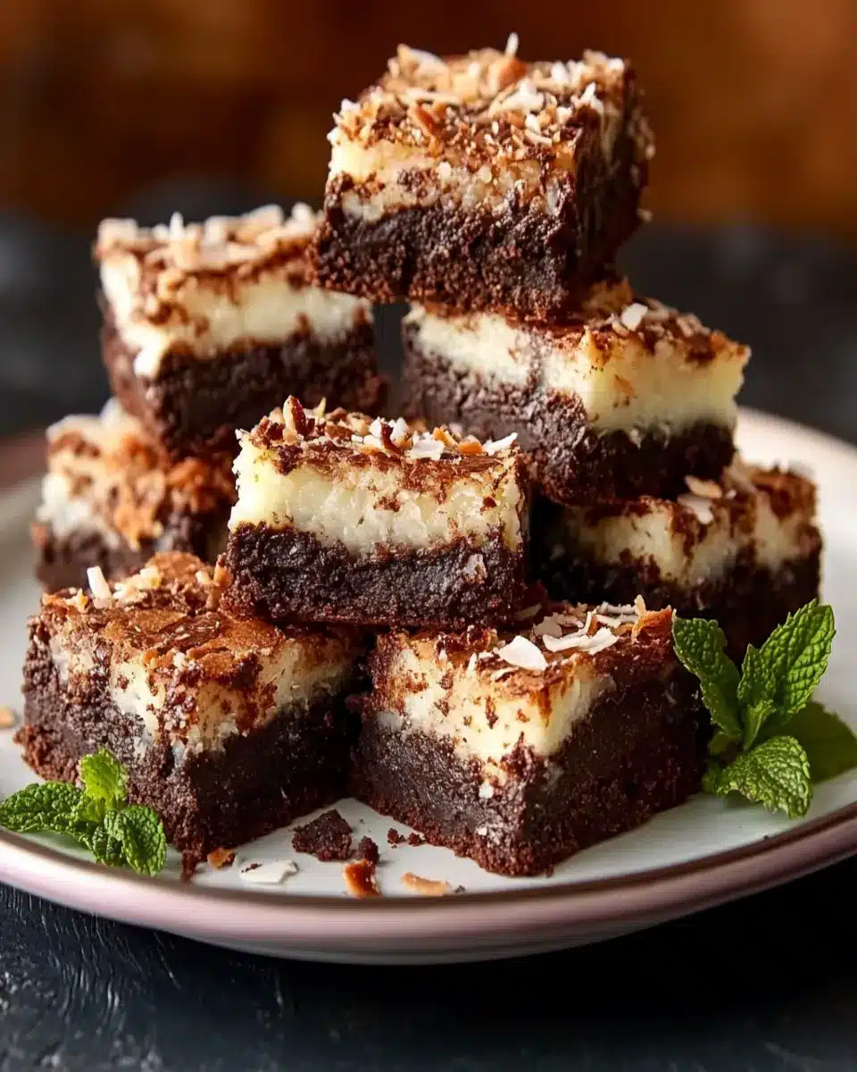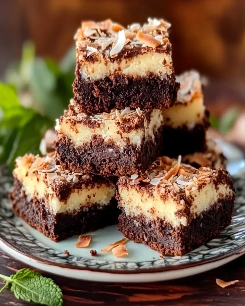 Not only are these brownies a feast for the eyes with their luscious layers, but they also deliver on flavor. The combination of sweetened shredded coconut and semisweet chocolate chips creates a textural contrast that is both satisfying and indulgent. Whether you’re serving them at a gathering or enjoying them as a personal treat after a long day, these brownies promise to bring joy with every bite.