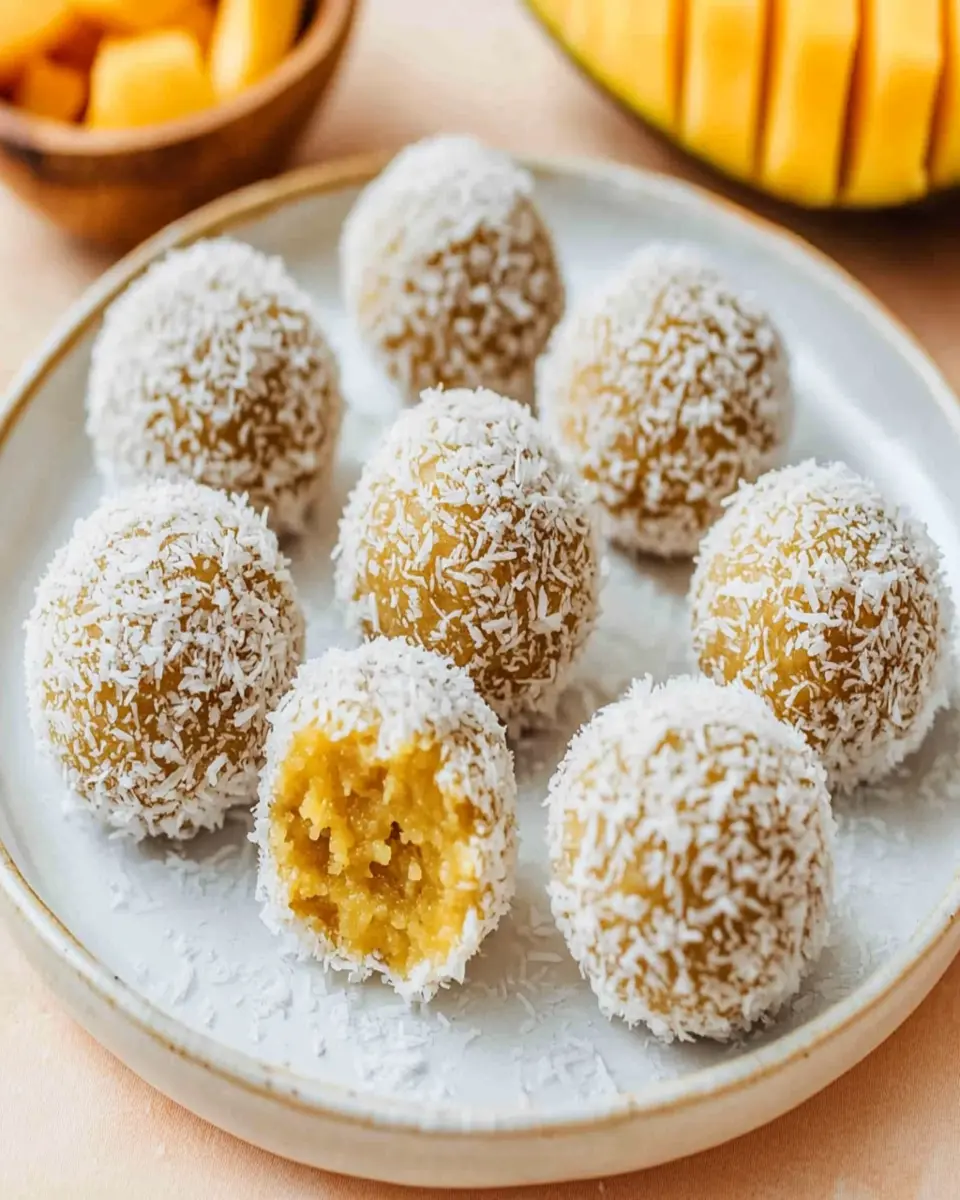 Delicious and healthy coconut mango bliss balls, perfect for a snack or dessert.