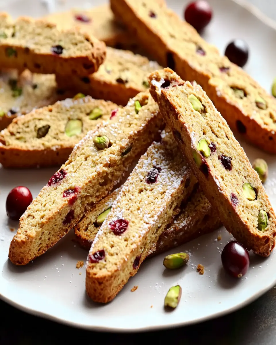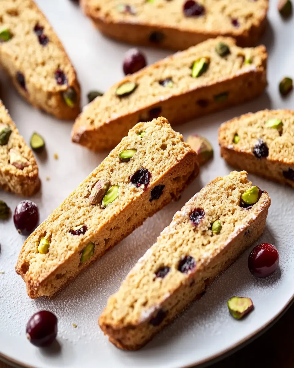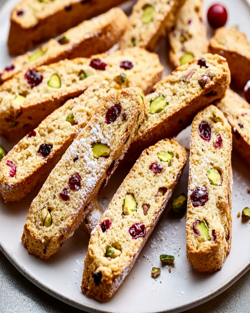 Deliciously crunchy biscotti studded with cranberries and pistachios, perfect for dipping in coffee or tea.