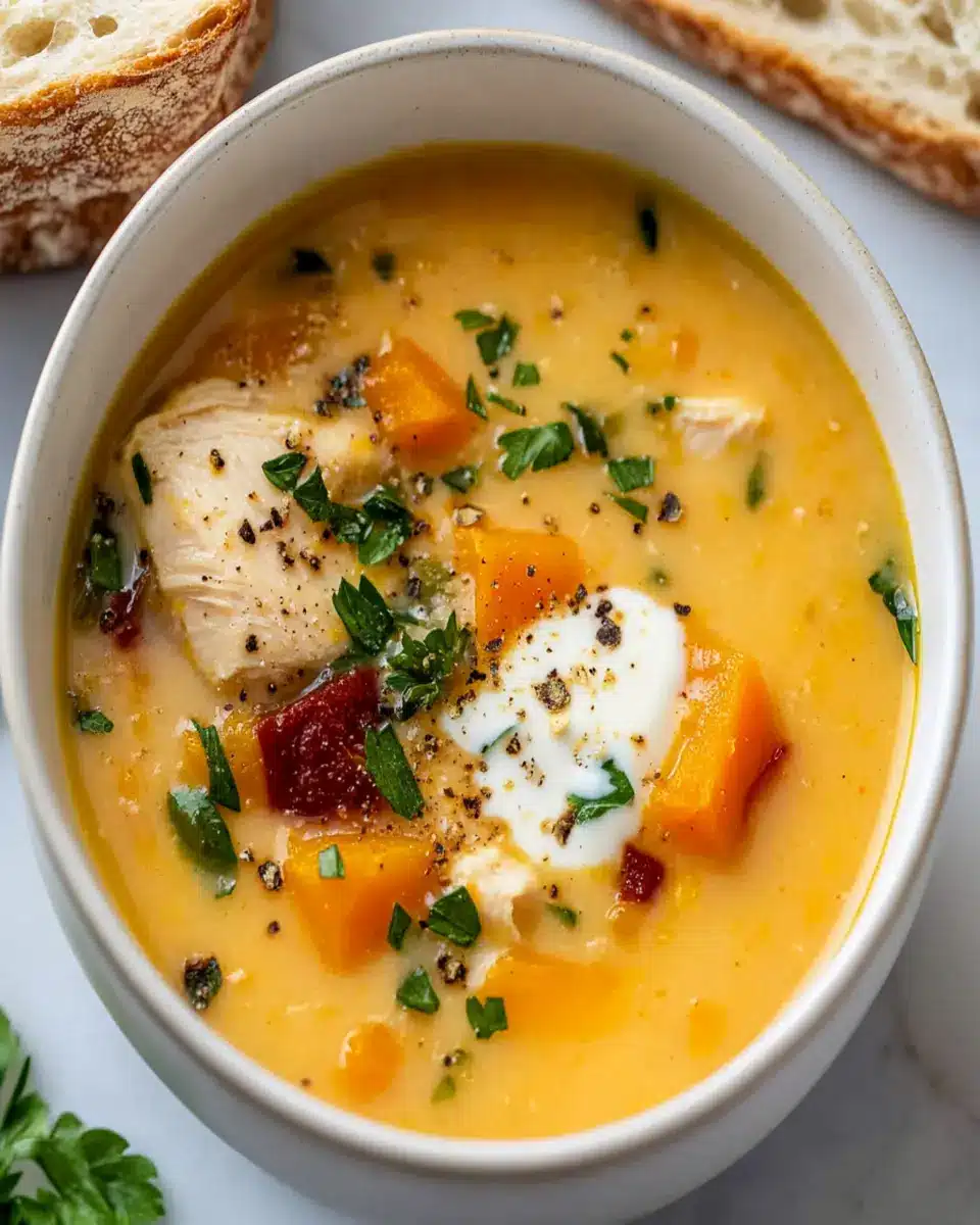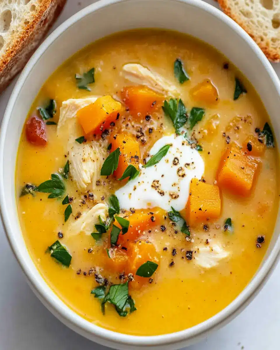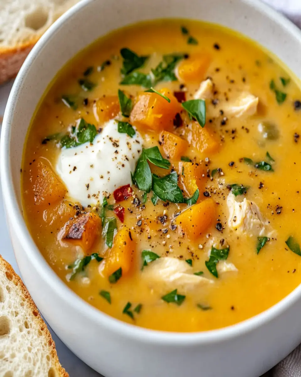 A delicious and creamy soup made with chicken and butternut squash, perfect for chilly days.