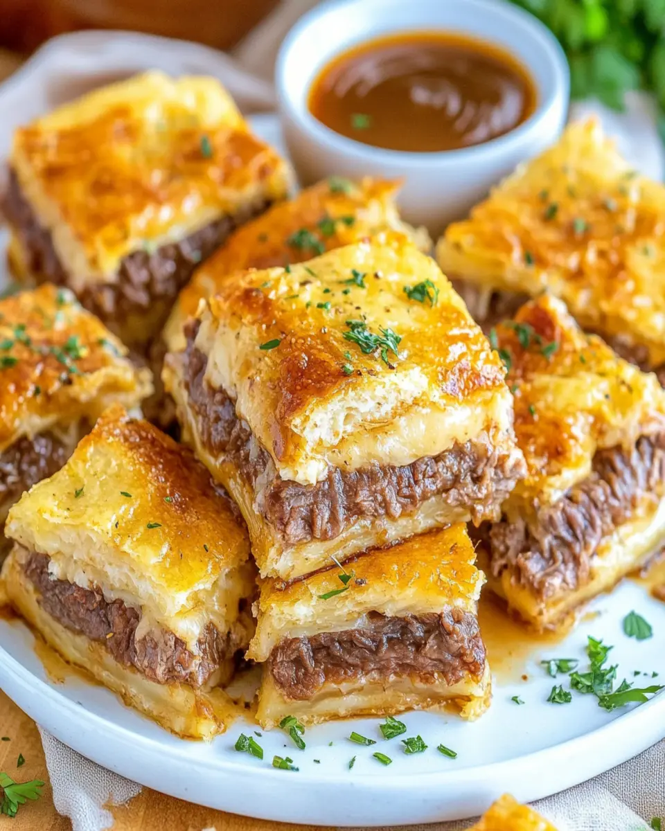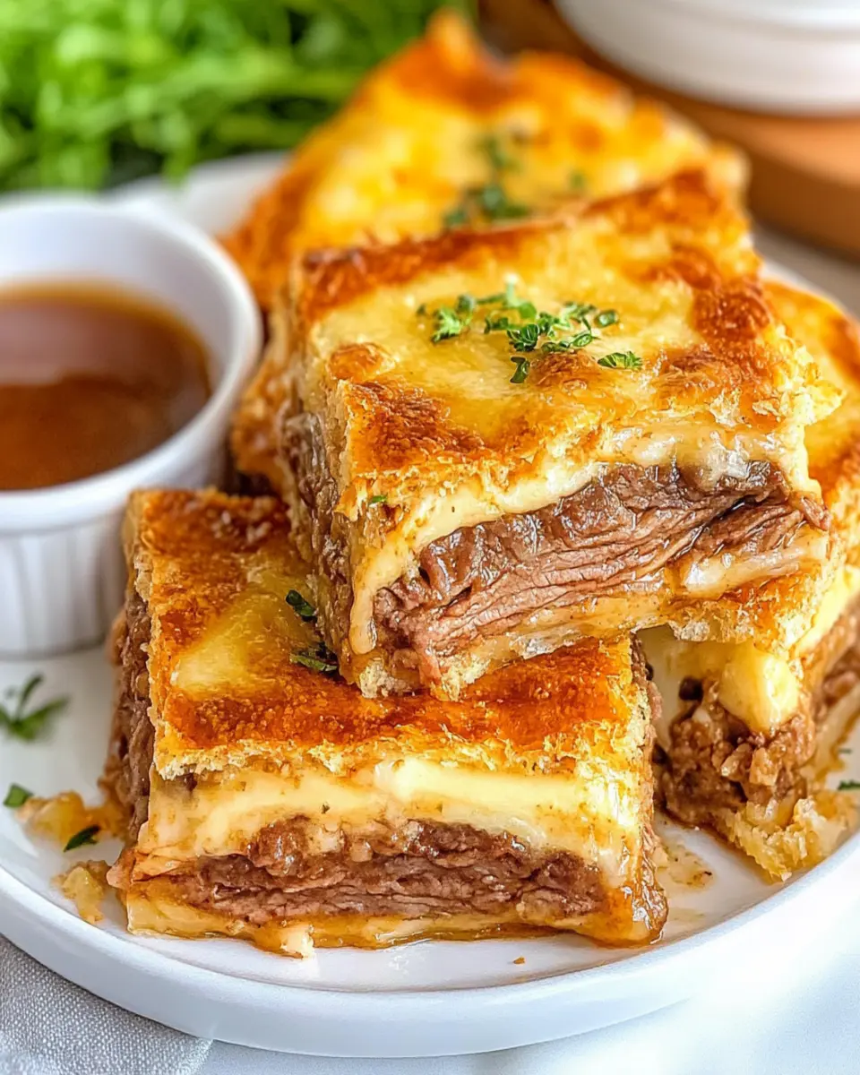 The Delicious French Dip Squares Recipe is not only a crowd-pleaser but also a fantastic choice for young professionals and food lovers alike. This easy-to-make appetizer provides a perfect blend of savory beef, melted provolone, and crispy bread, all complemented by a flavorful dipping sauce.