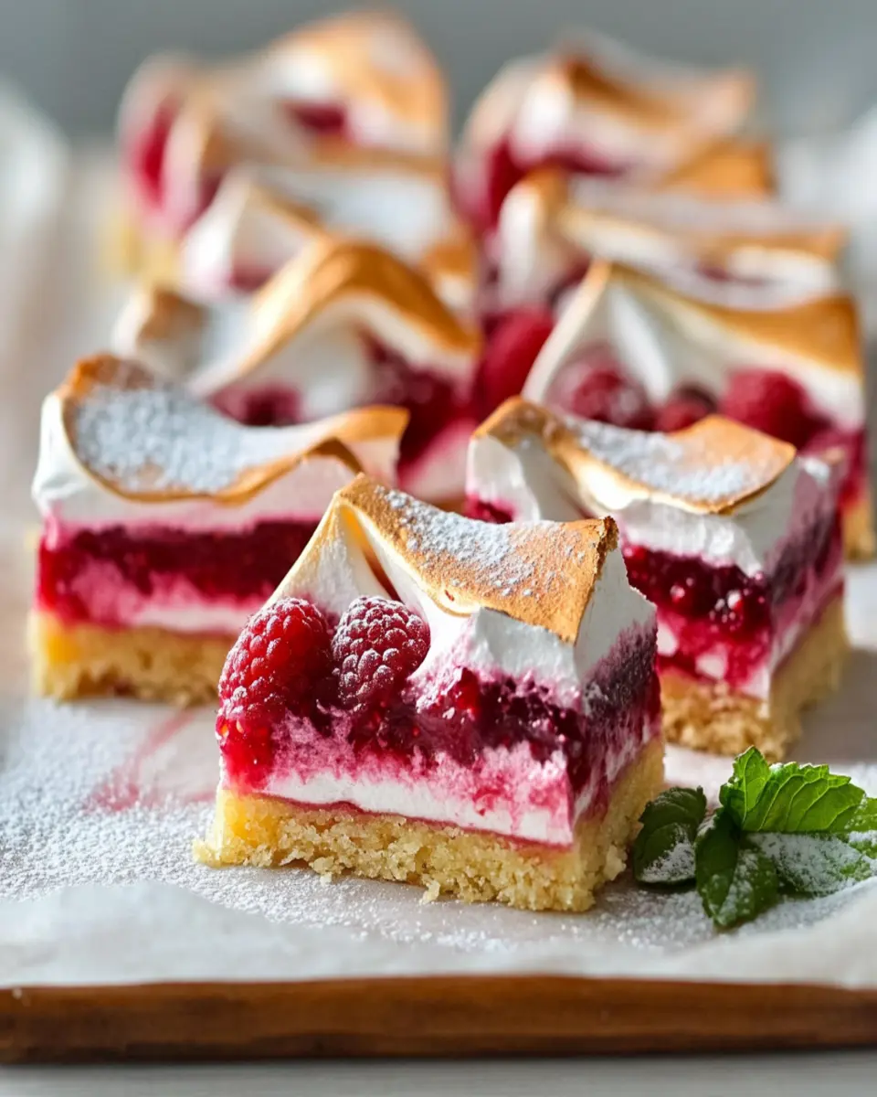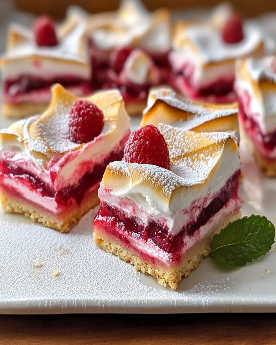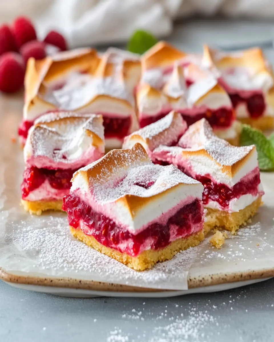 A scoop of vanilla ice cream or a dollop of freshly whipped cream complements the tartness of the raspberry filling beautifully, adding a creamy richness that contrasts with the light meringue. For an elegant touch, consider serving the bars with a sprinkle of lemon zest or a drizzle of raspberry sauce, which not only enhances the flavor but also adds visual appeal.