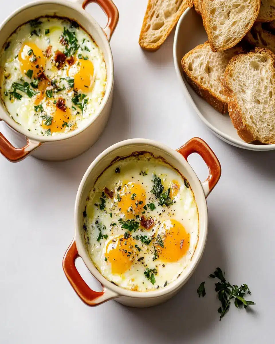 Serve your Eggs Cocotte with crusty bread or buttery croissants. These make perfect companions for scooping up the creamy eggs, enhancing each bite with delightful texture.
