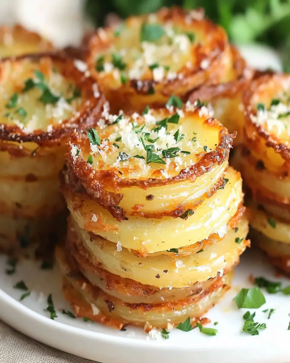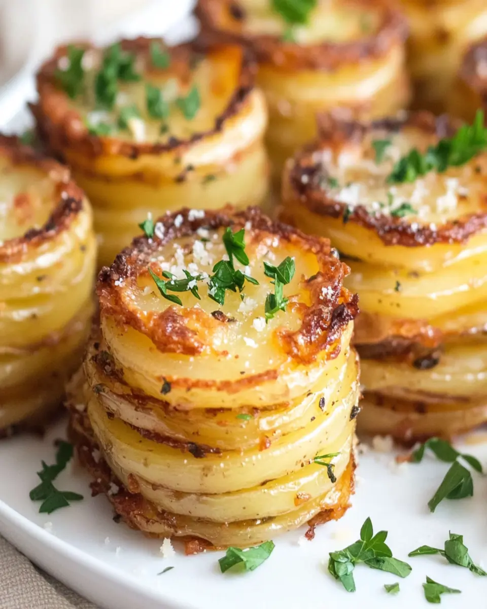 These Garlic Potato Stacks are a delicious side dish made with crispy layers of garlic-infused potatoes. Perfect for any meal!