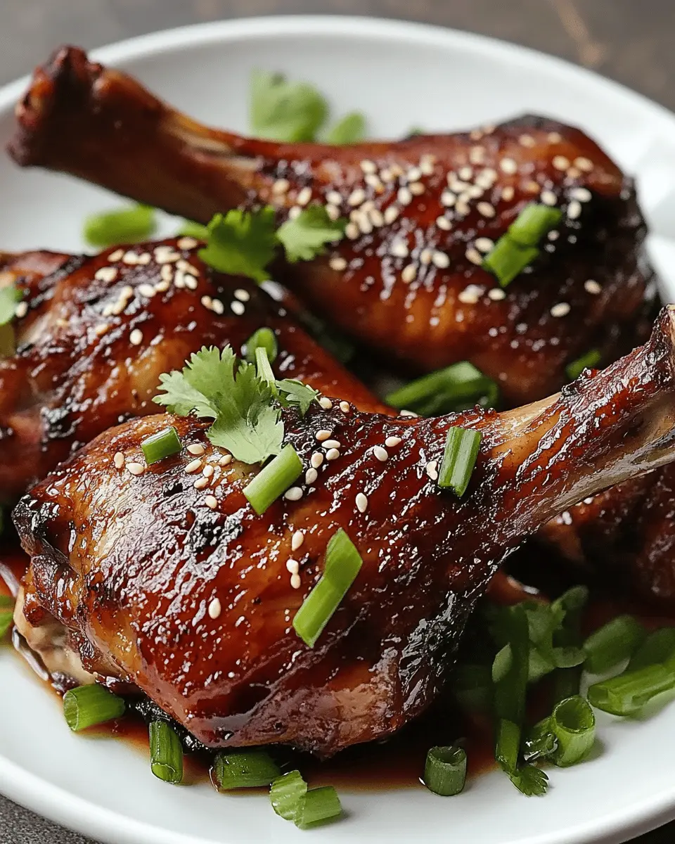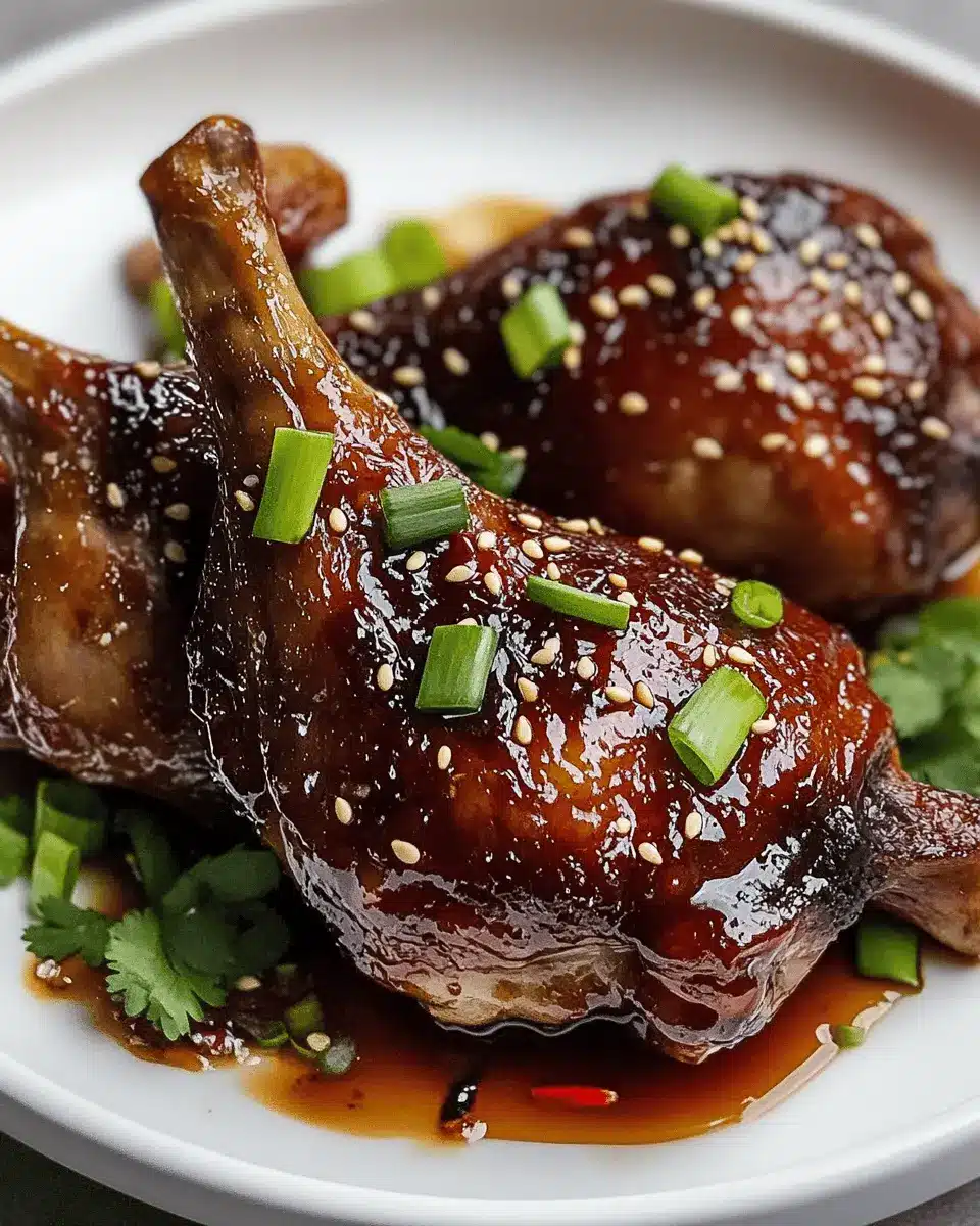 Succulent duck legs marinated in a flavorful ginger-soy glaze, perfect for a special dinner.