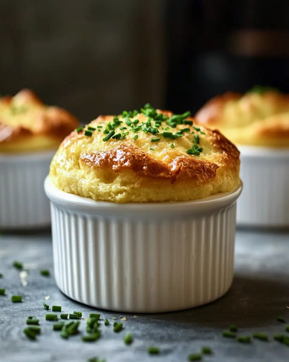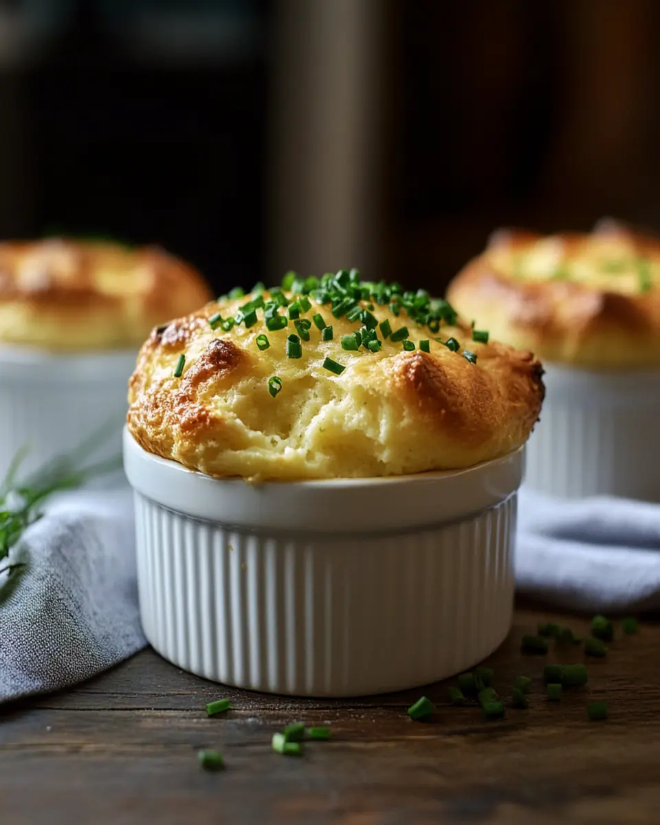 A light and fluffy cheese soufflé infused with the fresh flavor of chives. Perfect for a special occasion or as a delightful side dish.