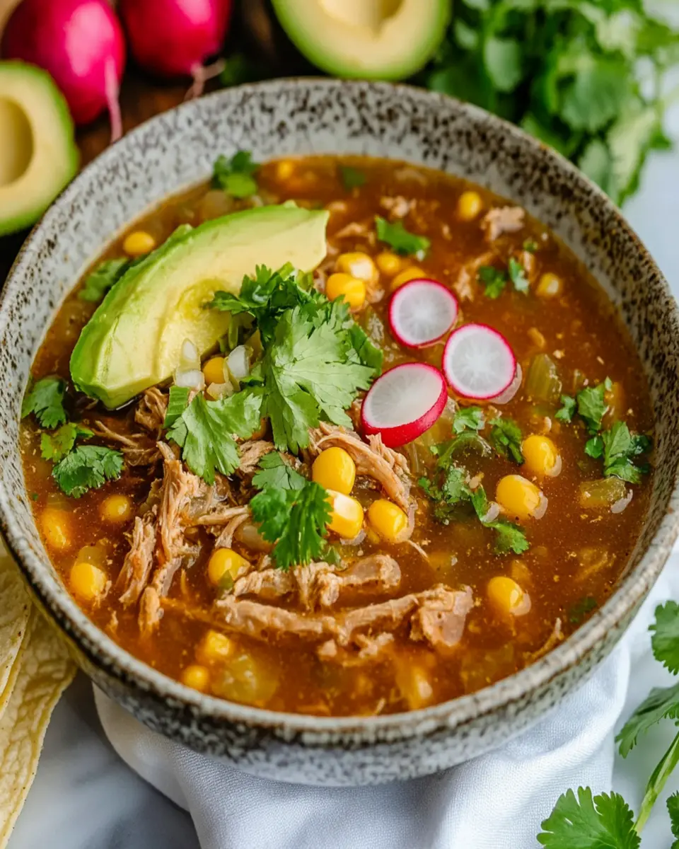 A hearty and flavorful Mexican hominy and pork soup, filled with spices and tender meat.