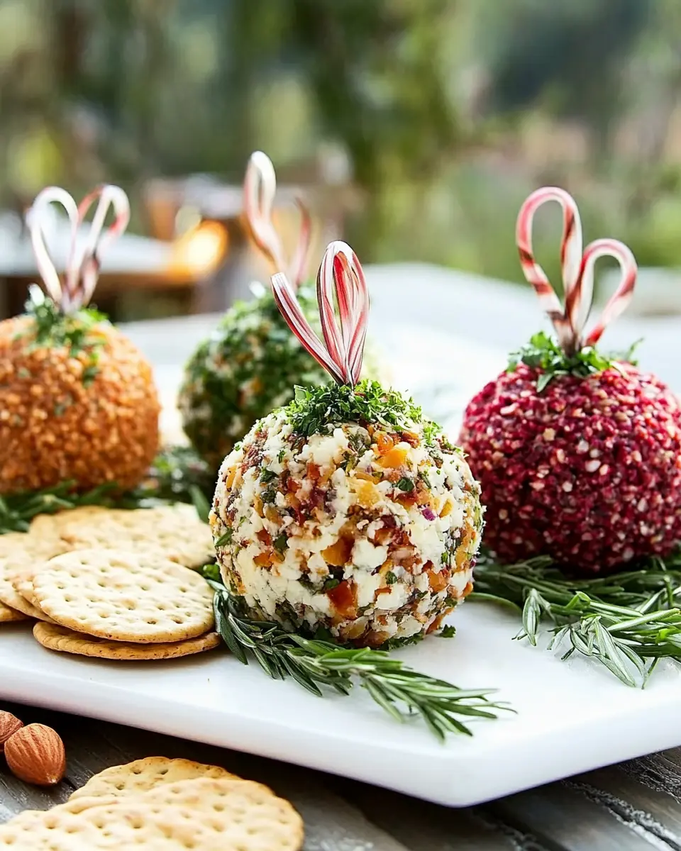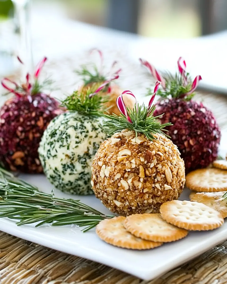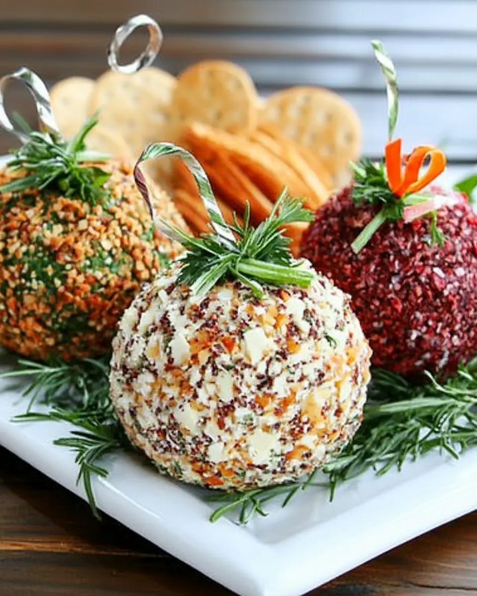 A delightful trio of cheese balls decorated as holiday ornaments, perfect for festive gatherings.