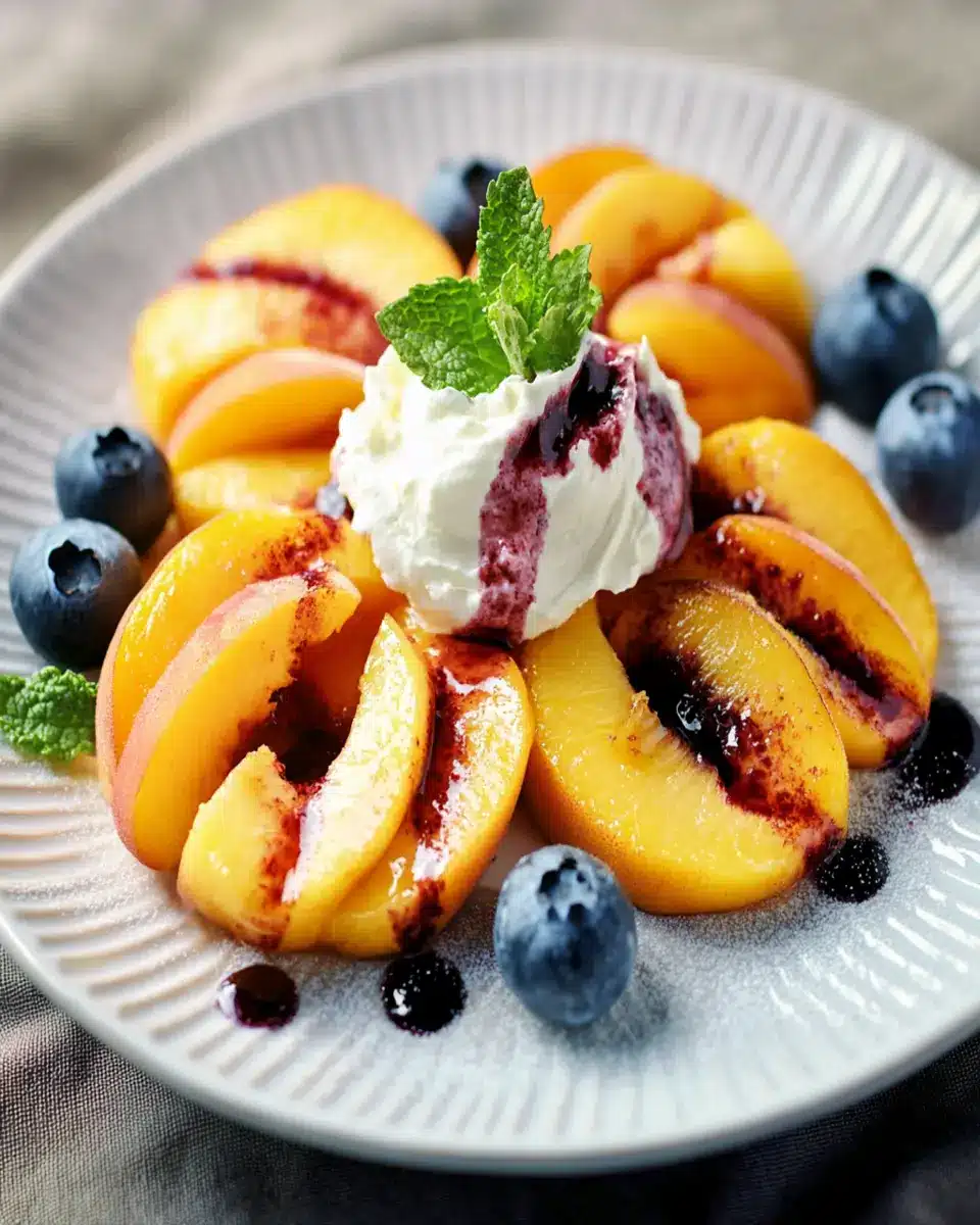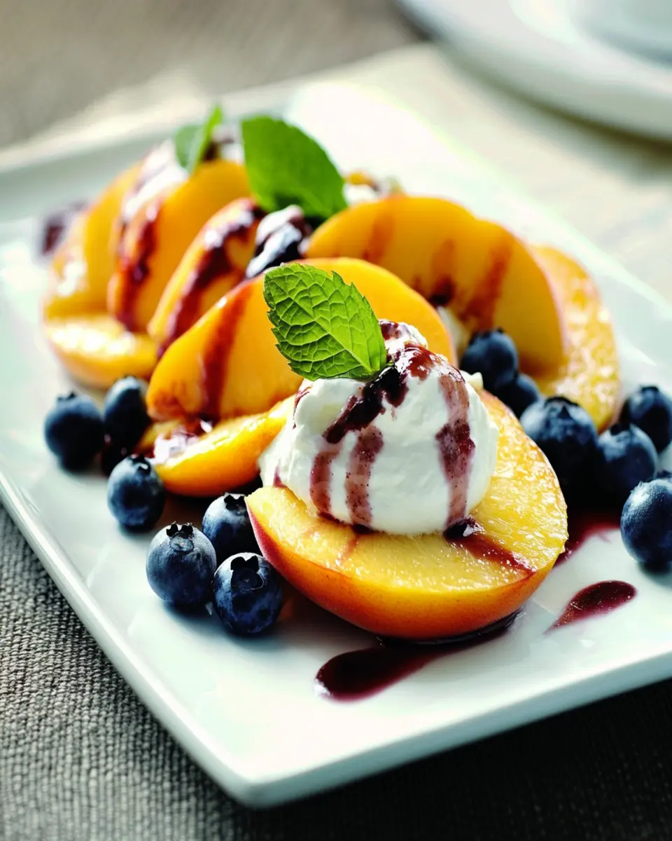 A delicious summer dessert featuring fresh peaches and blueberries topped with creamy mascarpone.