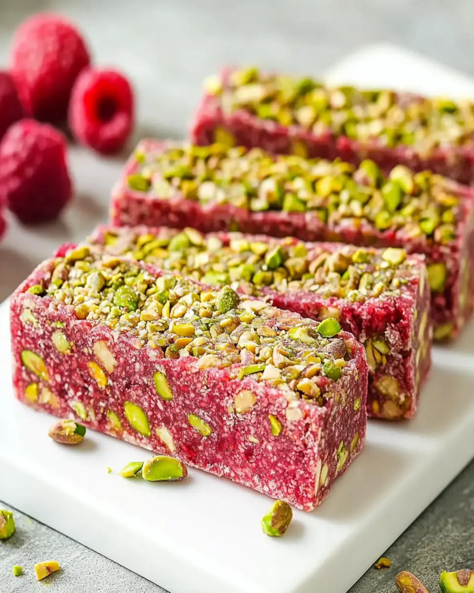 Pistachio raspberry energy bars are nutritious snacks made from unsalted pistachios, rolled oats, fresh raspberries, and a blend of sweeteners and almond butter. They are perfect for a quick breakfast or a healthy snack on the go.