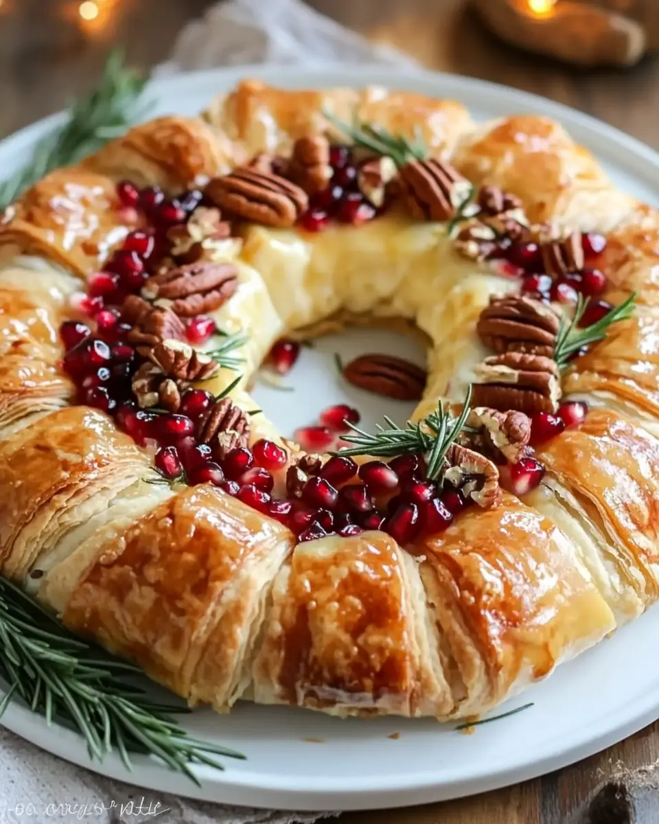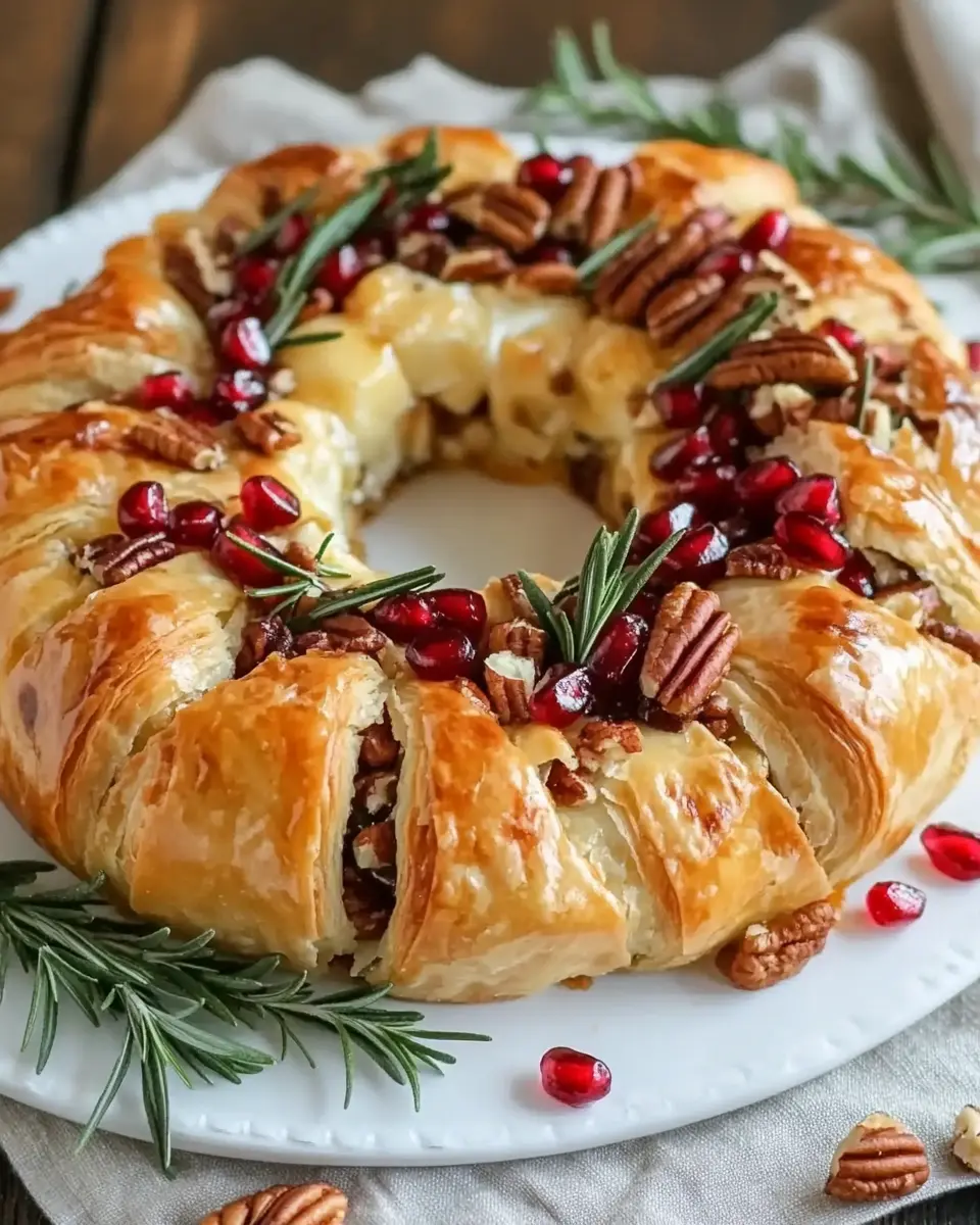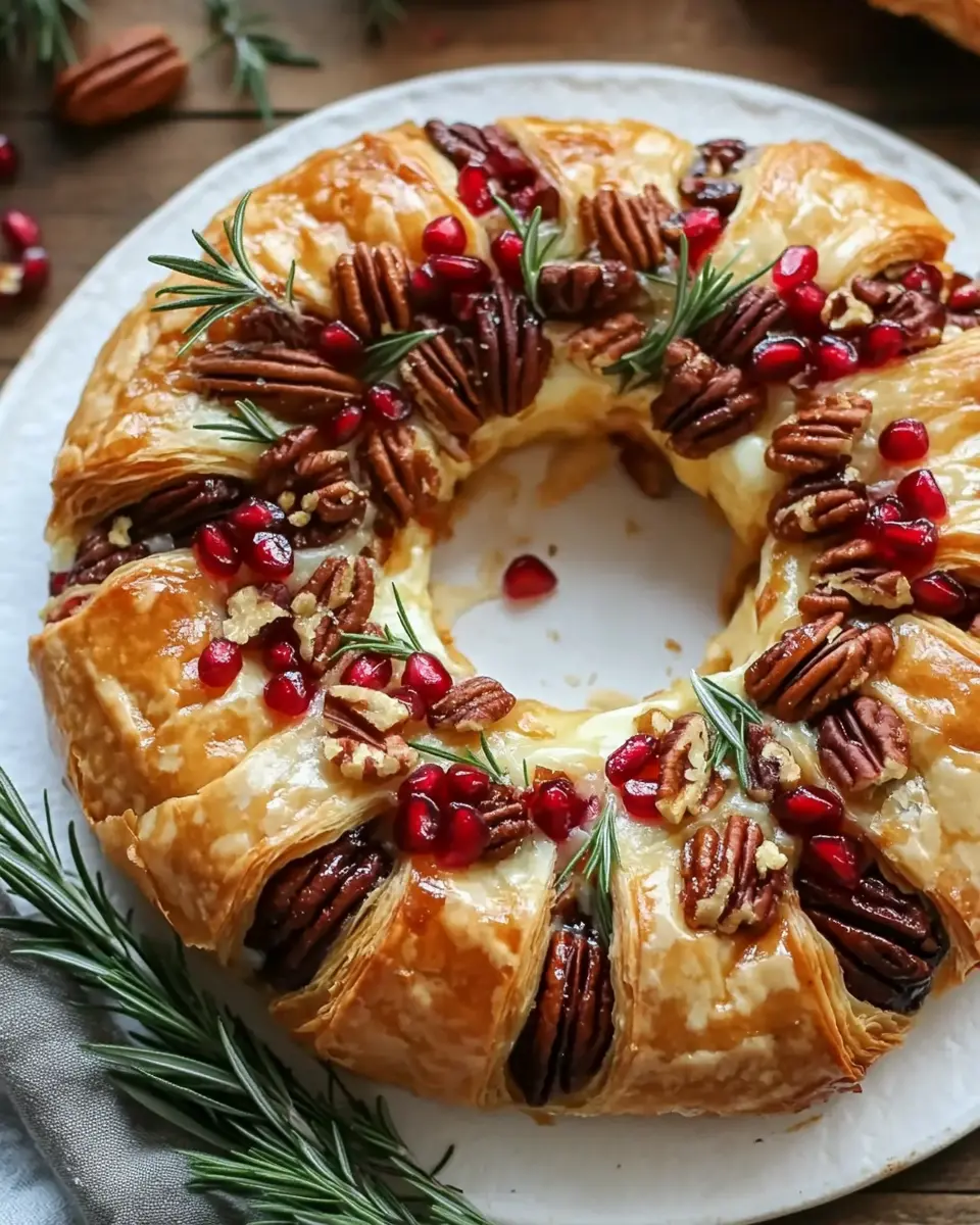 The Pomegranate Pecan Baked Brie Wreath is not just a dish; it’s an experience that combines flavor, texture, and visual appeal, making it perfect for any gathering. This festive appetizer is a crowd-pleaser, featuring rich, melty Brie cheese, sweet and tart pomegranate arils, and crunchy pecans all wrapped in flaky puff pastry. It’s the kind of dish that will have your guests raving about your culinary skills.