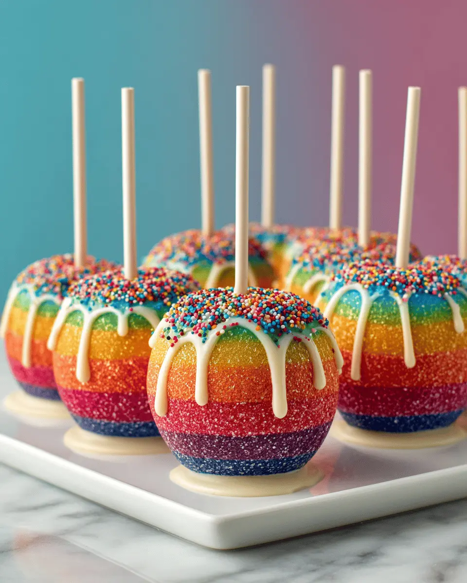 In summary, rainbow candy apples are not just a treat; they embody the joy of creativity and celebration. Using fresh, crispy apples offers a delightful crunch that balances the sweet, colorful candy coating. As you experiment with different toppings, the vibrant hues will turn heads and spark smiles at gatherings. These apples are perfect for parties, fall festivals, or simply indulging your inner child. Plus, making them can be a delightful bonding experience. So gather your friends or family, and create your own stunning batch of rainbow candy apples to share—the sweetest adventure awaits!