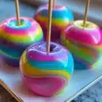 To keep your rainbow candy apples fresh and delicious, store them in a cool, dry place, preferably in a single layer. Avoid refrigeration, as it can cause the candy coating to become sticky. If you need to stack them, place parchment paper between layers to prevent them from sticking together. They’re best enjoyed within a few days but are tasty enough to last longer if you can resist the temptation!