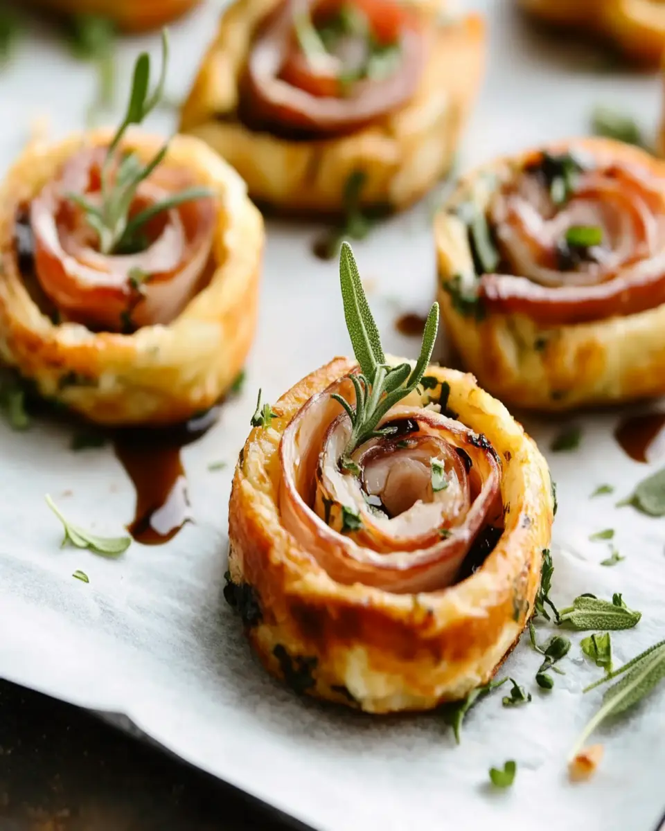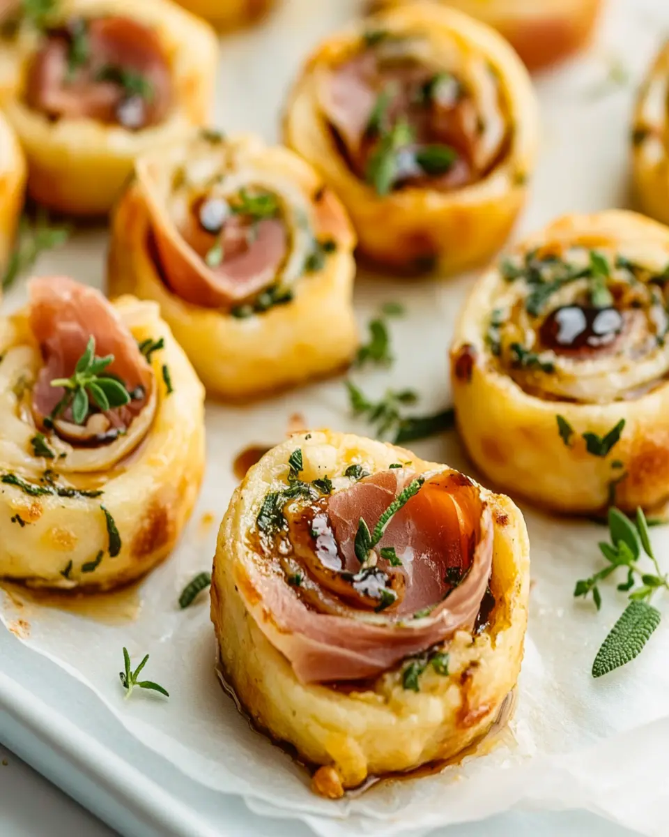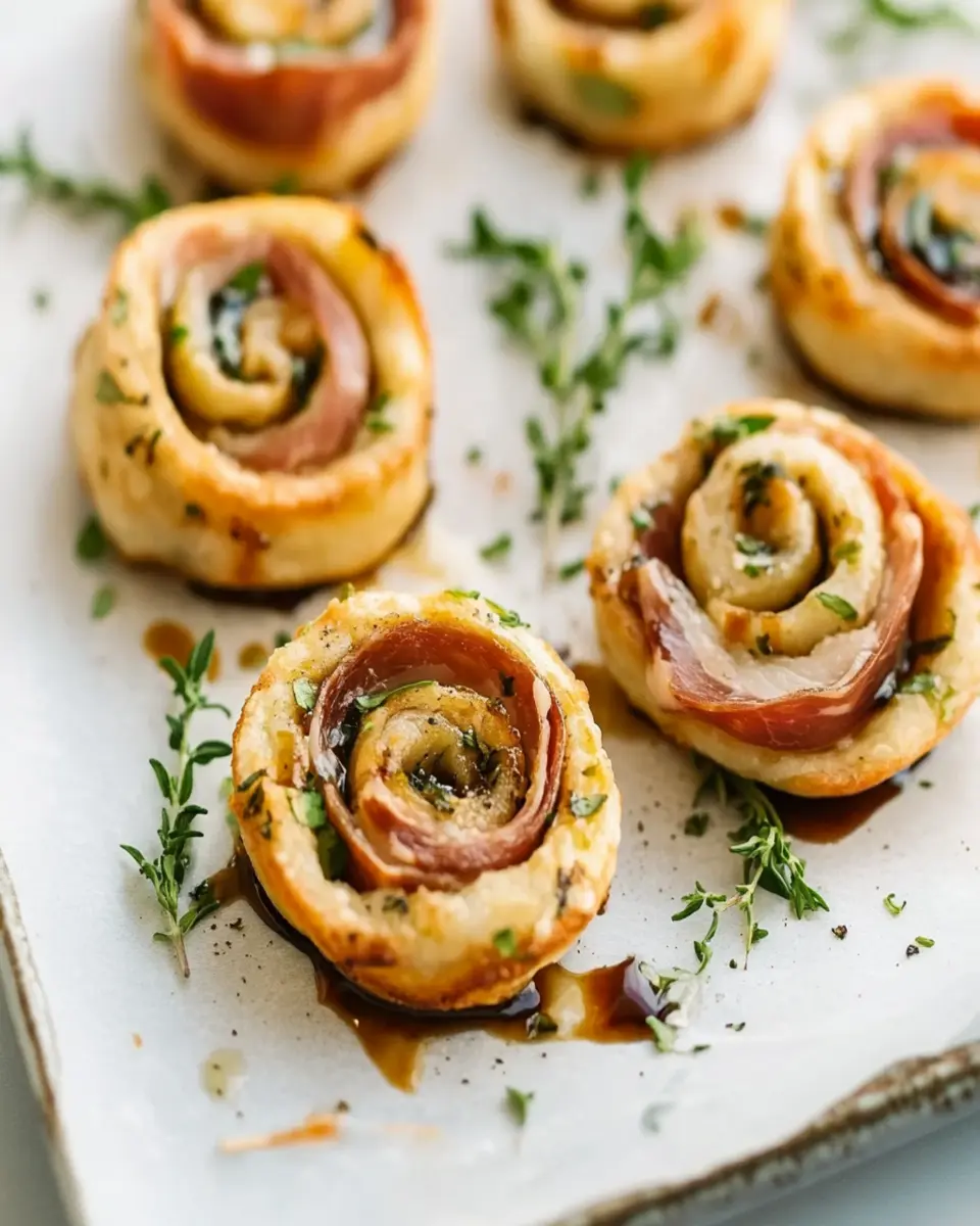 Sage & Prosciutto Pinwheels are a delicious appetizer made by wrapping prosciutto around a creamy filling of softened cream cheese mixed with fresh sage. They are baked until golden, resulting in a savory bite that is perfect for parties or gatherings.