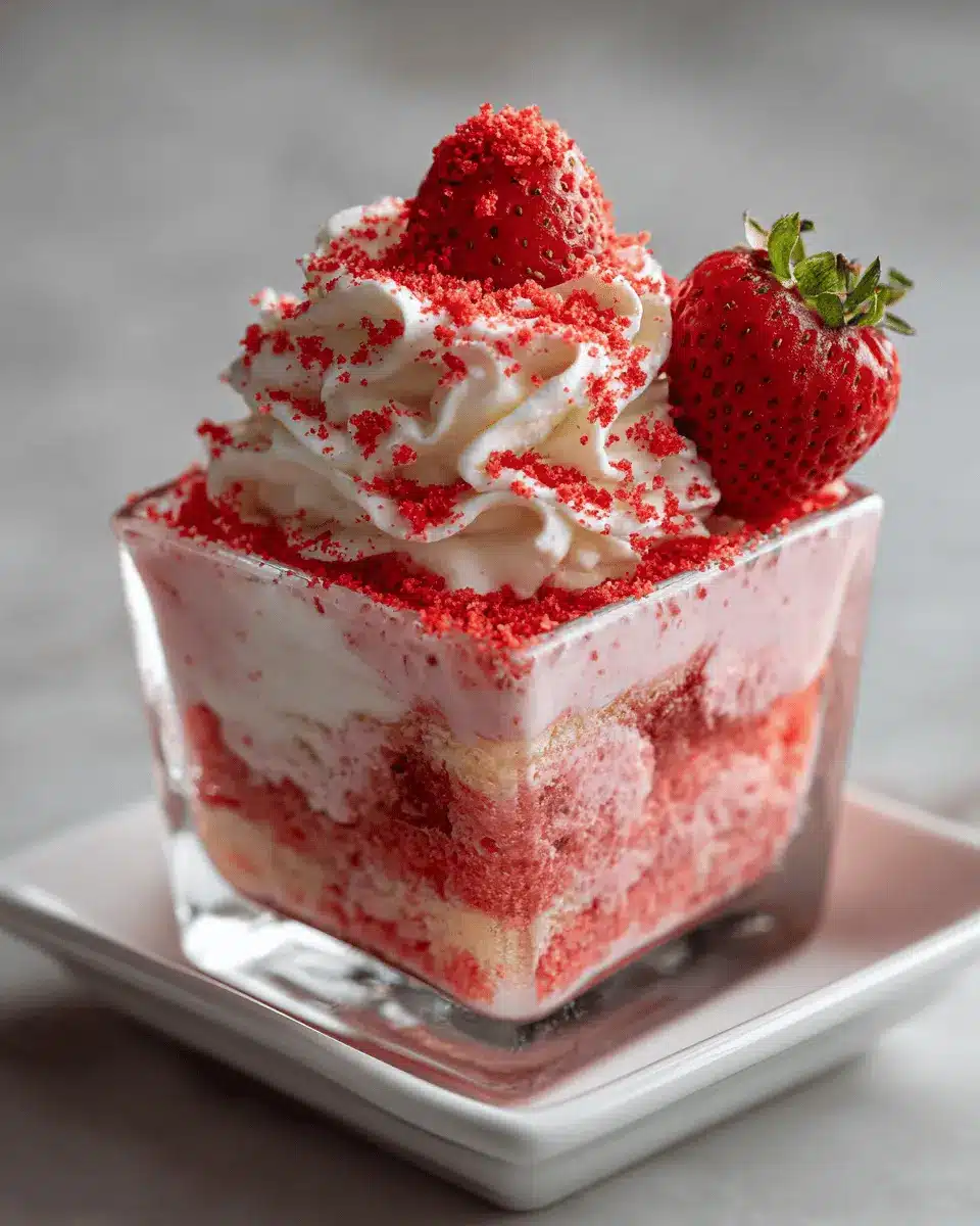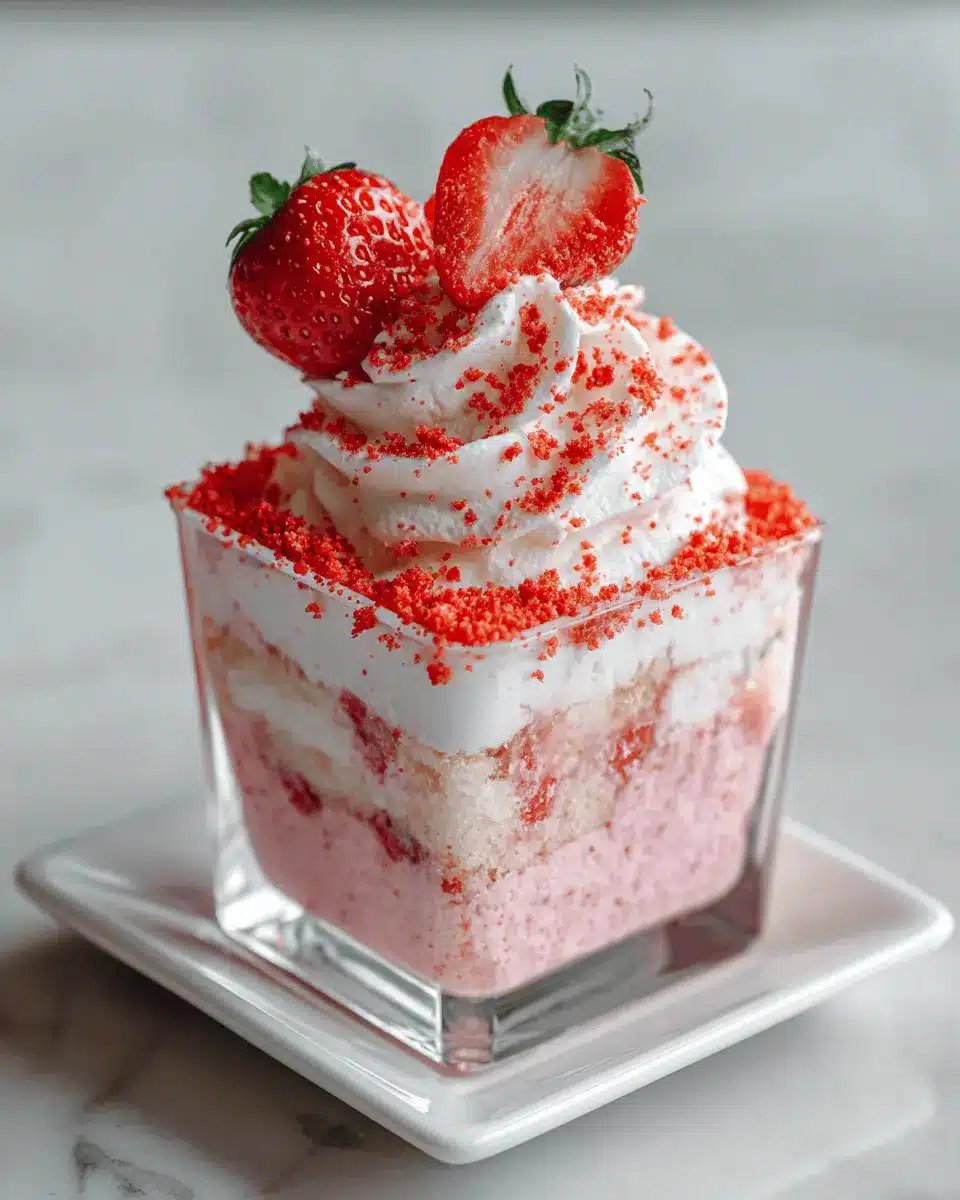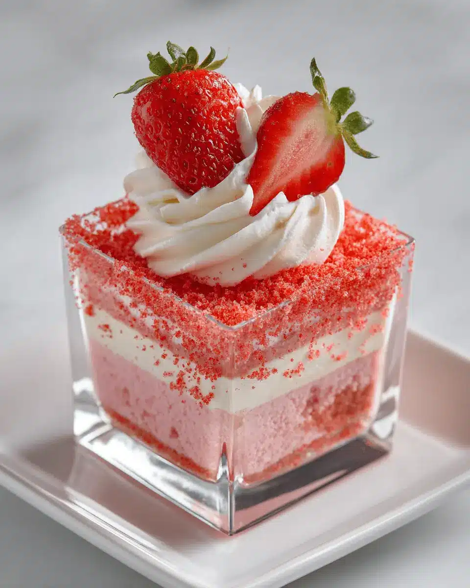 A delightful twist on the classic tres leches cake, served in individual cups with layers of moist strawberry cake, creamy milk soak, whipped cream, and strawberry crunch topping. Perfect for parties, picnics, or an elegant dessert table!