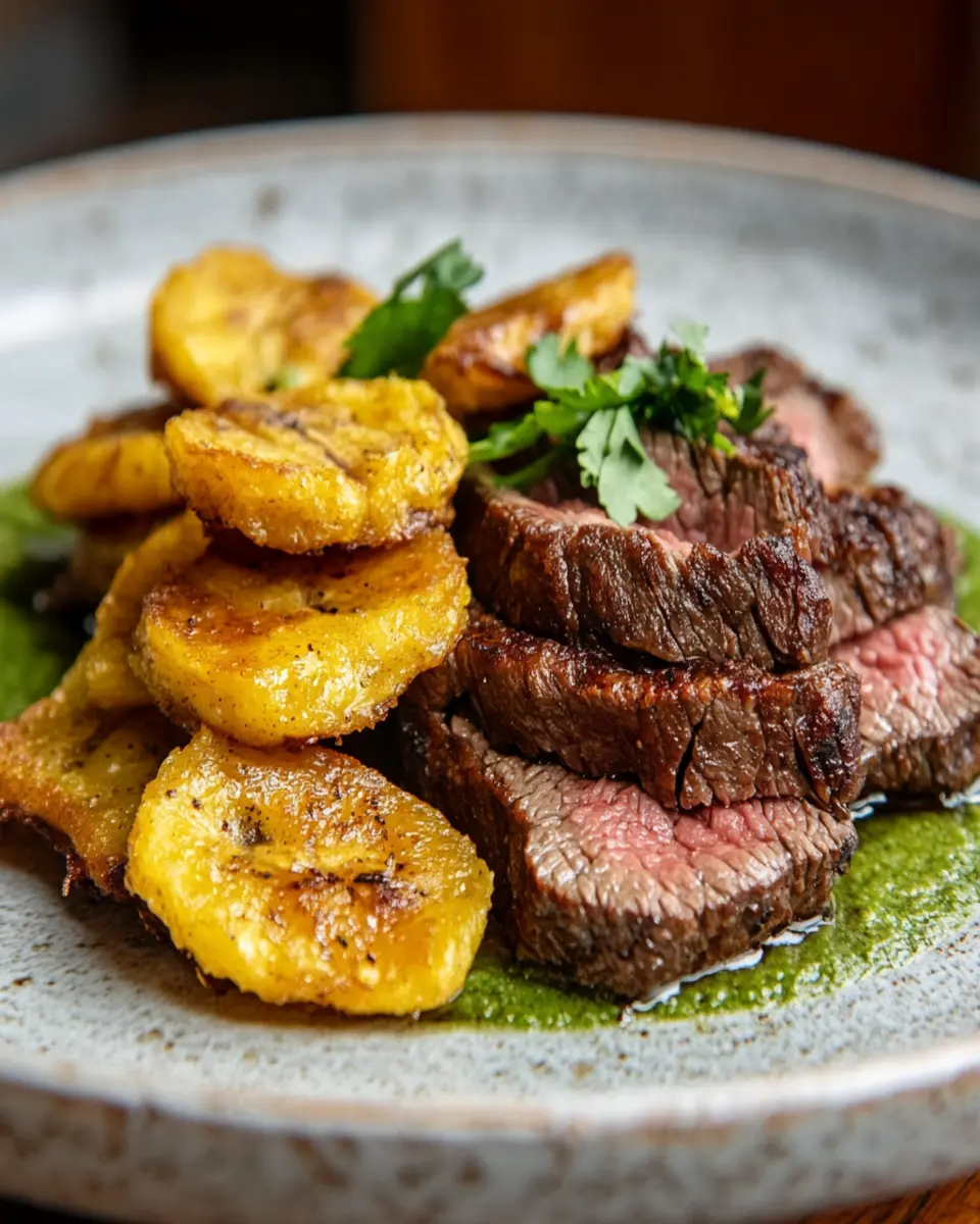 The contrast of crispy, sweet plantains with perfectly cooked flank steak creates a symphony of taste that will leave you wanting more. The use of beef tallow not only elevates the flavor but also ensures that each plantain slice is golden and crispy, making every bite memorable.