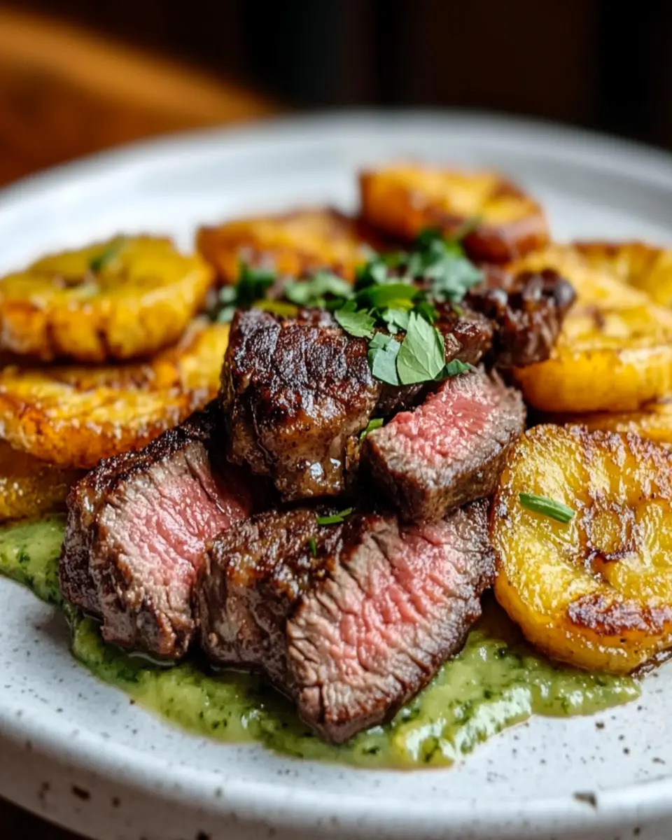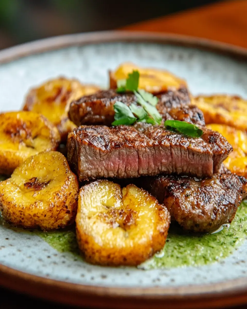 Try topping your dish with fresh cilantro, diced avocado, or a squeeze of lime. These fresh ingredients can brighten up the flavors and add a refreshing contrast to the rich steak and plantains.
