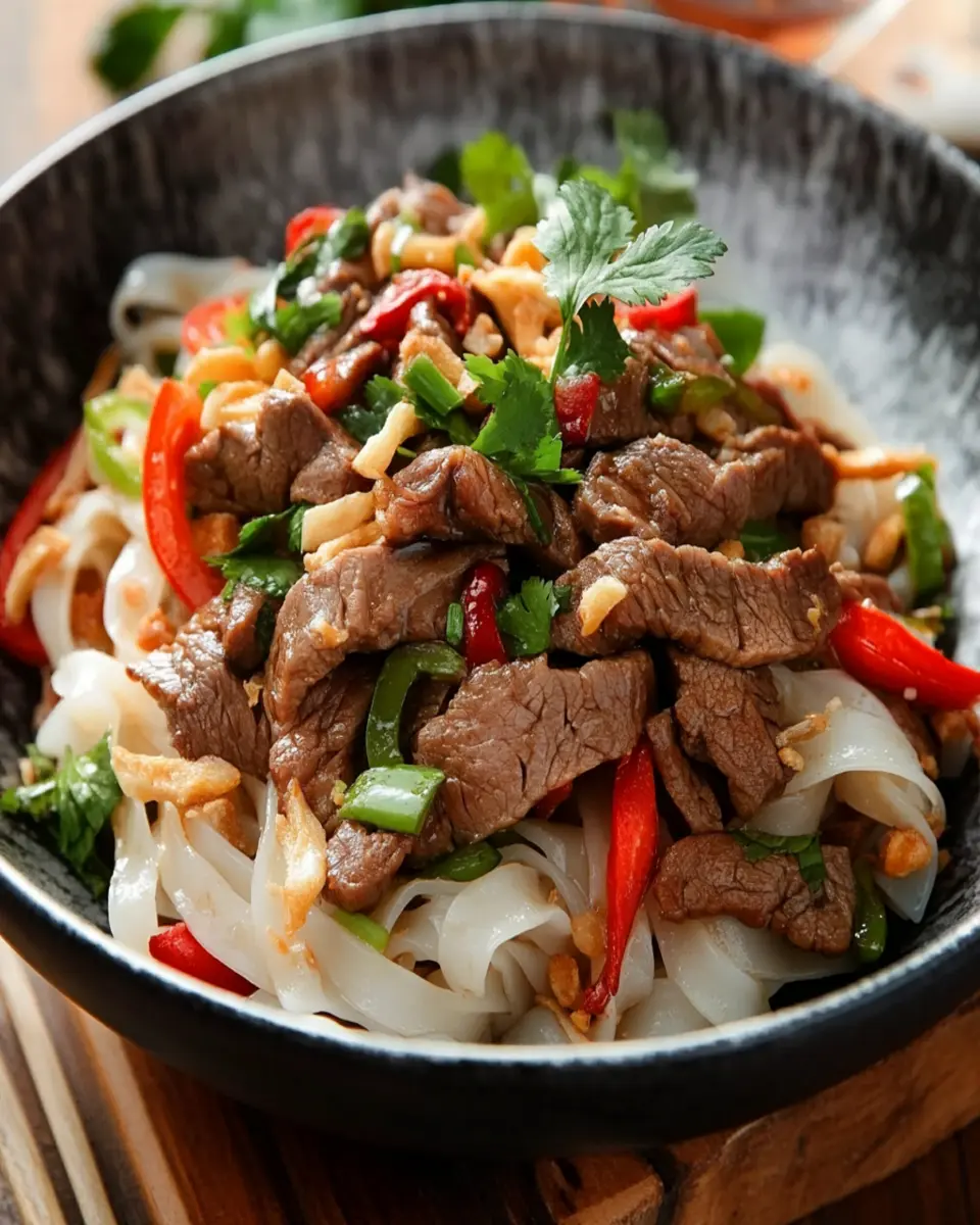 The spiciness of Thai Wide Rice Noodles with Beef can be adjusted according to your taste. While the base recipe is mild, you can add chili flakes or fresh chili to enhance the heat level. This customization makes it suitable for various palates.