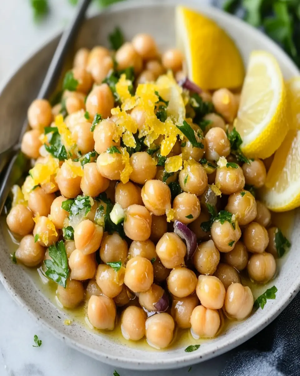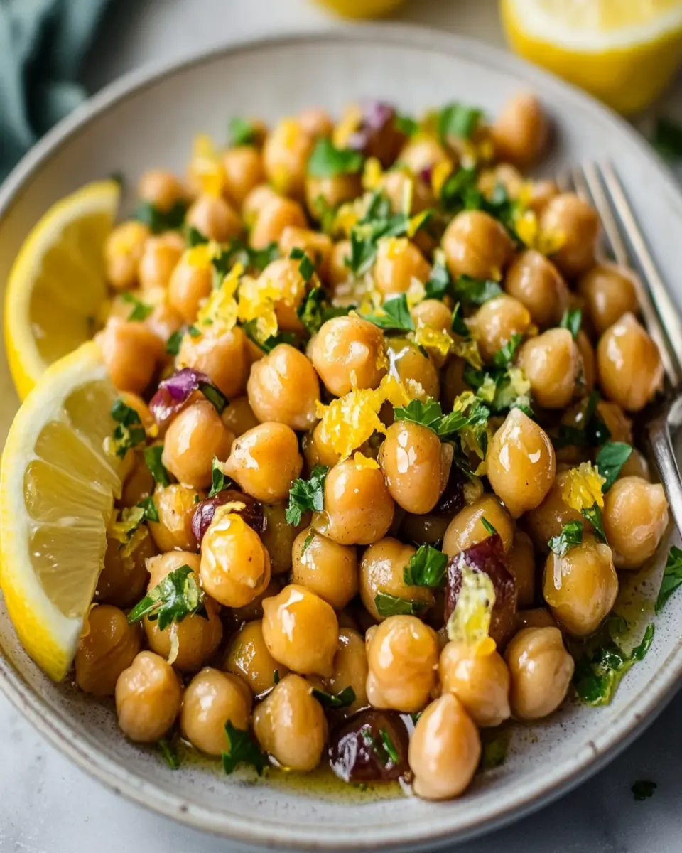 A simple and flavorful dish featuring warm chickpeas tossed with lemon juice and olive oil.